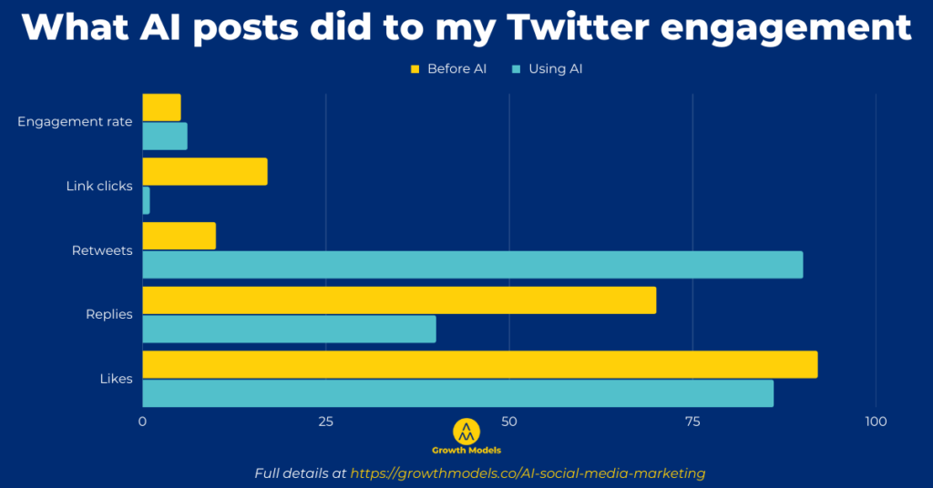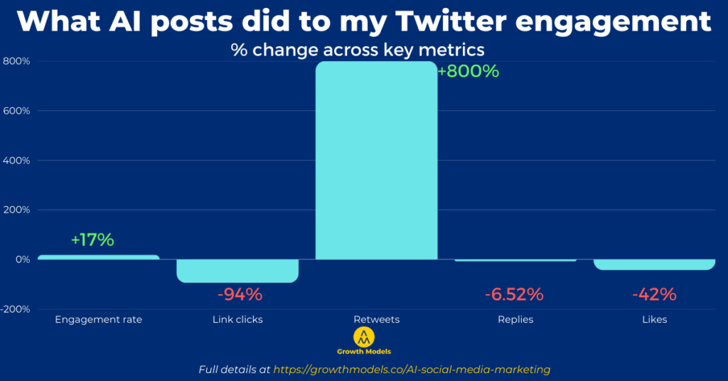 Basically, the AI helped get a huge increase in retweets without comments, but didn’t really help in any other area in a meaningful way.