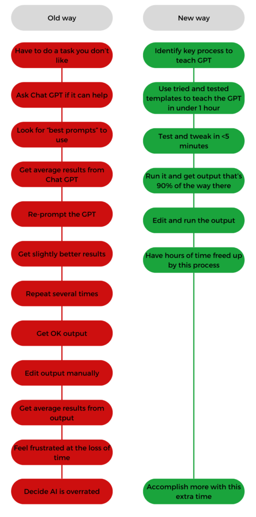 Effortlessly create Custom GPTs in just one hour to save countless hours of wasted time – without endless coding, frustration, or ineffective “prompting”.