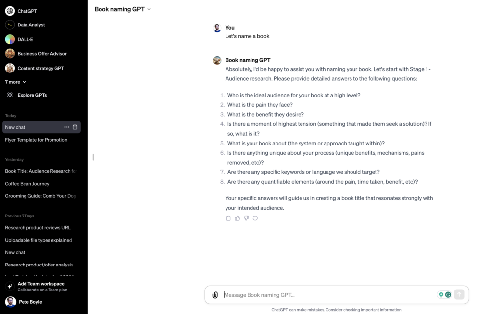 I’ll share with you one of the Custom GPTs I’ve built so you can see exactly what it looks like working in real life. I often sell access to these, either as a service or directly to the GPT.