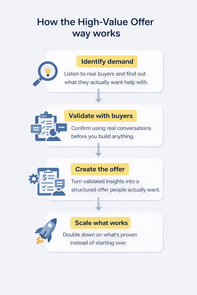 High-Value Offers is a buyer-led system for creating offers people actually want to pay for — before you waste time building, launching, or marketing the wrong thing.