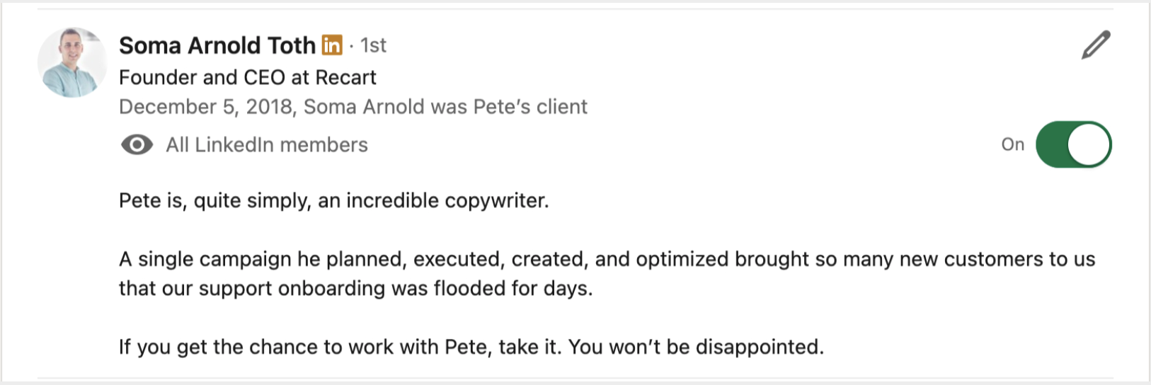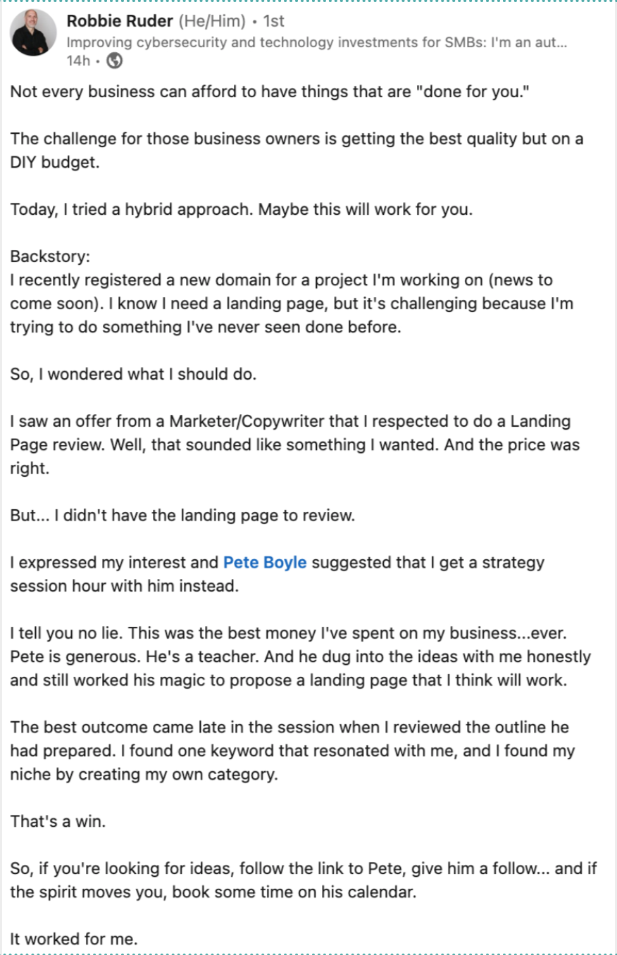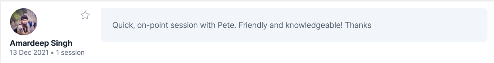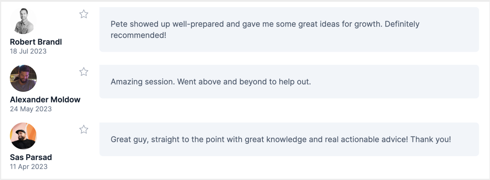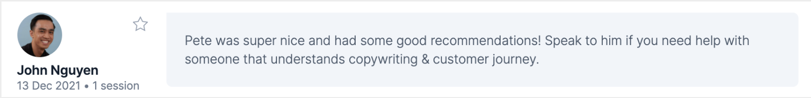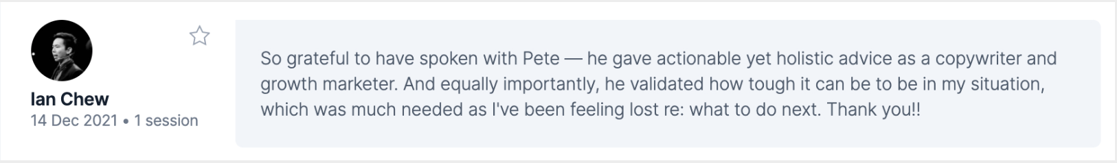 So grateful to have spoken with Pete — he gave actionable yet holistic advice as a copywriter and growth marketer. And equally importantly, he validated how tough it can be to be in my situation